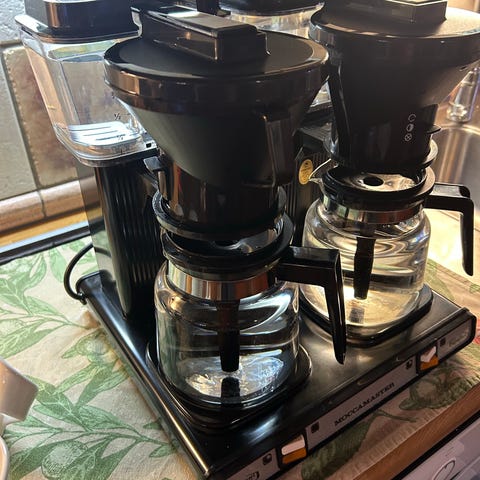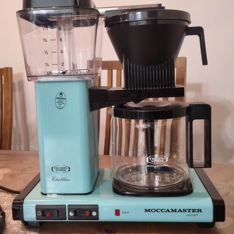 Moccamaster-kahvinkeitin, jossa on kaksi lasista pannua. Pannut vaihdettu uusiin sekä toinen vesisäiliön kansista. Keitin puhdistettu kahvikeittimiin tarkoitetulla cleaning aid:lla. Täysin toimiva ja hyvä kuntoinen.