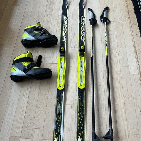 Peltonen Sonic-sukset pitopohjalla ja Rottefella Kids-siteillä, jotka sopivat NNN-standardin monoille. Meiltä löytyy tarvittaessa näihin sopivat koon 32 monot sekä 95- ja/tai 75-senttiset sauvat sopuhintaan.