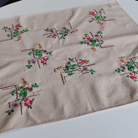 Hieno, yksinkertaisen tyylikäs, käsityö. Silitystä vailla ehjä, tahraton (ei ainakaan silmiini osunut, kun kääntelin). Harvinaisem kokoinen, ja hyväkuntoinen.