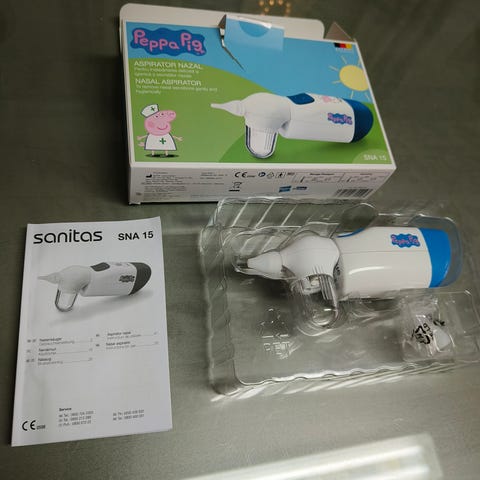 Käyttämätön Sanitas merkkinen nenäimuri. Ei meillä sitten ikinäkään tullut käyttöön, kun unohtui kaappiin ja käytettiin aina vaan perinteistä nenäimuria😁 Paketti vain vähän revennyt, kun avattu ja katsottu laitetta. Patterit on sisällä ja toimii!☺️