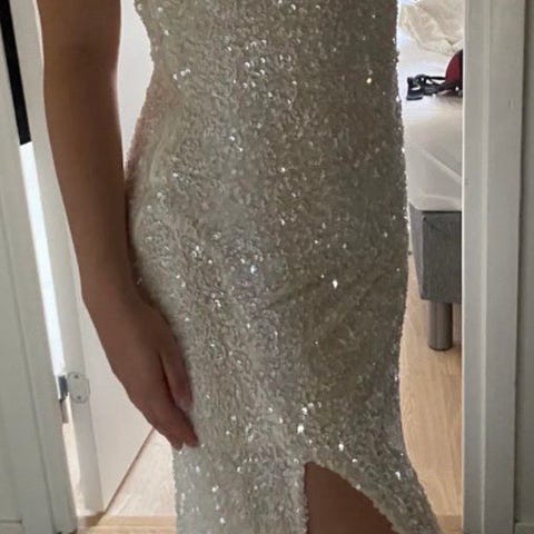 Häämekko, koko M, väriltään valkoinen. Mekko on valmistettu paljeteista, mikä antaa sille koristeellisen ja kiiltävän pinnan. Soveltuu naisille.