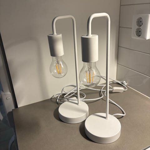 Muutaman vuoden käytössä olleet yöpöytävalaisimet. Valaisimissa luurin langaton ja langallinen latausmahdollisuus. Vastaava Ikean täysmetallinen malli 69€, mutta vanhempi malli puisilla osilla ehkä tyylikkäämpi. Myydään yhdessä, tai erikseen. Ilmoituksessa hinta/kpl