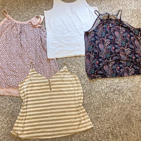 Hyväkuntoisia, ehjiä, puhtaita toppeja. Hihattomia. Osassa naruolkaimet, osassa leveämmät. Kaikki menee koolle XL. Yhteensä 16 kpl. Alustopeiksi ja kesävaatteina. Lemmikitön ja savuton koti.