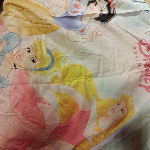Pussilakanan koko 110x145cm, tyynyliina noin 33x60cm. 90-luvulta.