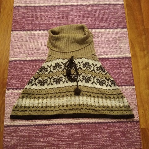 Musta, Desigual poncho, sopii S-L-kokoa käyttävälle. Ponchon pinnassa on "neulenyppyä" ja huomasin helmassa muutaman hiukan purkaantuneen kohdan. Katso kuvat! Nämä on huomioitu hinnassa. Näppärä pystyy kuitenkin korjaamaan.