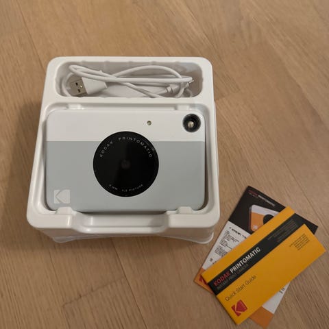 Kodak Smile Instant Print Digital Camera on kannettava laite, joka yhdistää digitaalisen kameran ja välittömän valokuvan tulostuksen. Kamera on mustavalkoinen ja sisältää pienen näytön kuvan esikatselua varten. Laitteessa on mukana tulostustarvikkeet, kuten tulostuspaperi ja mustekasetti.