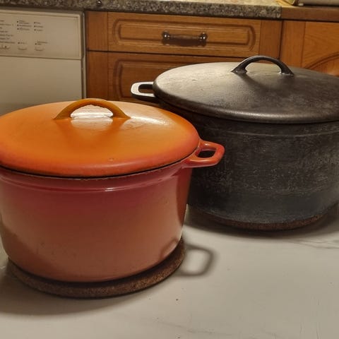 Högforsin emaloitu 6,5 litran valurautapata. Vuosikymmeniä vanha, ollut kovassa käytössä, kuten kuvasta näkyy. Yksi särökin löytyy sisäpinnasta, mutta ei vuoda. Uusi elämä puutarhassa on padan unelma.
