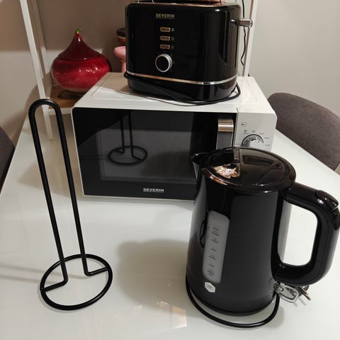 Setti sisältää mikroaaltouunin, leivänpaahtimen, vedenkeittimen ja leipälaatikon.