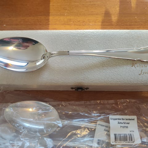 Vain laatikossa levänneet lähes uutta vastaavat, (ei kaiverruksia), sterling hopeiset 925/1000 ruoka-/jälkiruokalusikat. Pituus noin 168 mm ja paino noin 230 grammaa. Harvoin näitä Chippendale sterling aterimia tarjolla! Uusiin verrattuna nyt on halpaa ja hyvää tarjolla, jos on edes vastaavia uusia myytävänä…Mukaan saa kohtuu kuntoisen rasian.