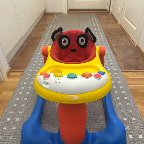 Emma kävelytuoli. Kunto muuten hyvä, mutta kankaassa pieni reikä. Ei haittaa käyttöä. Tarkempi pesu jää ostajalle.