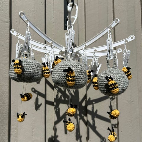 Pesän korkeus on noin 9cm ja leveys n.10cm. Päässä on virkattu ripustuslenkki. Ampiaiset ovat pituudeltaan n.4cm ja leveydeltään n.2cm.