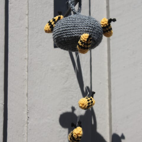 Uusi vaaleanharmaa virkattu valeampiaispesä/ampiaispesä.