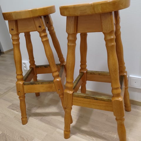 Kaksi mustaa baarijakkaraa. Käyvät sekä sisä- että ulkokäyttöön. Materiaali jonkinlaista kovaa muovia. En löytänyt merkkiä, hämärä muistikuva että olisiko veken kautta tilatut, mutta tästä ei varmuutta.