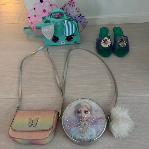 Settiin kuuluu 3 käsilaukkua (kissa käsilaukku, Frozenin Elsa käsilaukku ja perhoskäsilaukku), 2 kruunua ja lilat Prinsessa Sofia kengät (sisämitta noin 18cm). Nouto Kauniaisista tai postitus. Mmm.