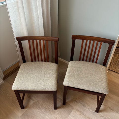Kuuden hengen ruokailuryhmä tukevaa puuta ja pehmustetuin tuolein. Pöydässä jatkopala, jolla pituus 178 cm, ilman jatkopalaa 125 cm. Hyvin pidetty ja siisti. Tuolien lankaat ehjät ja siistit.