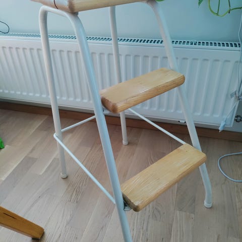 Yöpöytänä toiminut keittiöjakkara. Jokin ruuvi aina puuttunut joten hutera ettei kannata seistä sen päällä, toiminut kuitenkin varajakkarana eli voi myös istua.