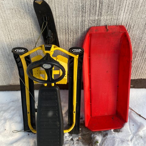 Stiga ja kaksi lasten pulkkaa. Sekä pini lasten lumikola. Väri punainen.