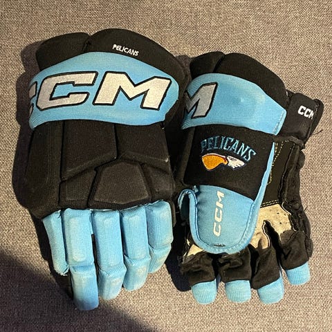 Myydään kuvankaltaiset, CCM-merkkiset jääkiekkohanskat Pelicanssin väreissä ja logoilla.