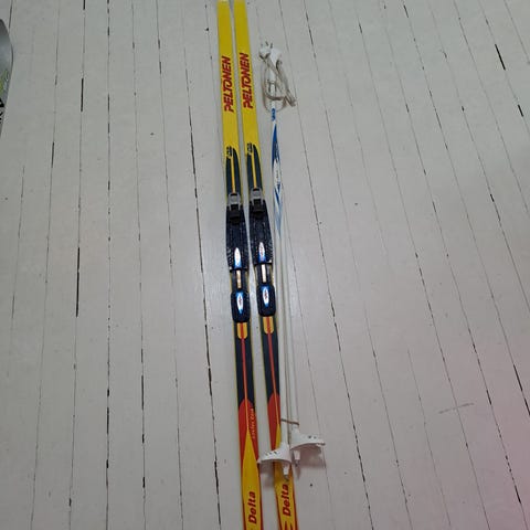 Peltonen sukset 120cm ja sauvat 90cm sopii noin 5-6v. lapselle.