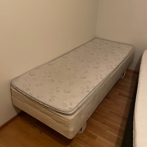 Annetaan sänky + jalat, 80cm×200cm. Jouset ovat hieman pinnassa, mutta ollut teinillä käytössä hyvän petarin kanssa. Lisäksi pohjasta yksi säle poikki.