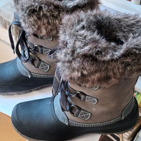 Vedenpitävät talvikengät, kuminauhanyöri ja pikalukkokiinnitys. Tekpkarvavuori. Pesty pesukoneessa edellisen käyttäjän jäljiltä, ehjät ja hyväkuntoiset.