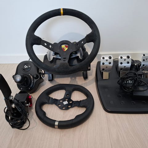 Logitech G920 ohjauspyörä ja polkimet Xboxille. Ohjauspyörässä on musta nahkapäällys ja keskellä Logitech G -logo. Polkimet ovat metalliset ja kiinnittyvät mustaan alustaan, joka sisältää kaasun, jarrun ja kytkimen. Laite on suunniteltu Xbox-käyttöön.