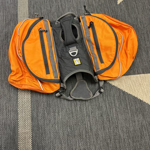 Koiran rinkka, joka jäänyt omalle koiralle liian pieneksi. Käytetty muutamia kertoja, mutta hyväkuntoinen. Taskuissa on hyvin tilaa vaelluksille esim. koiran omille ruuille. Voi tulla testaamaan omalle koiralle ennen ostoa.