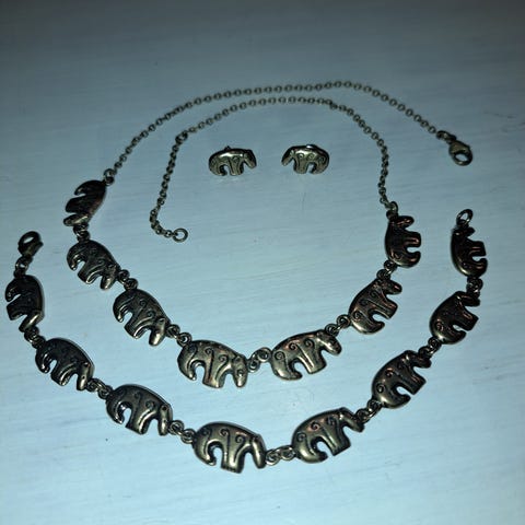 Hyväkuntoinen setti Kalevalakorun Kalevankarhua. Sisältää hopeisen riipuksen sekä hopeisen nilkka-/rannekorun