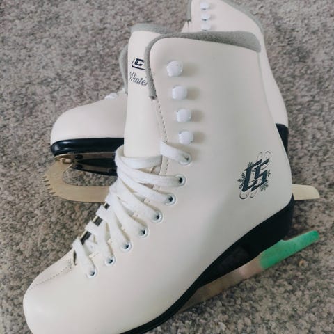 CCM Winter Club CS -kaunoluistimet koko WS6 eli 37 (pohjallisen pituus n. 24 cm). Kestävä ja tukeva malli, jossa lämmin nylon-sisävuori ja foam-pehmusteet. Pinnassa joitain naarmuja, mutta yleisilmeeltään siistit luistimet. Ei nimikointia. Luisteltu muutaman kerran edellisen teroituksen jälkeen.
