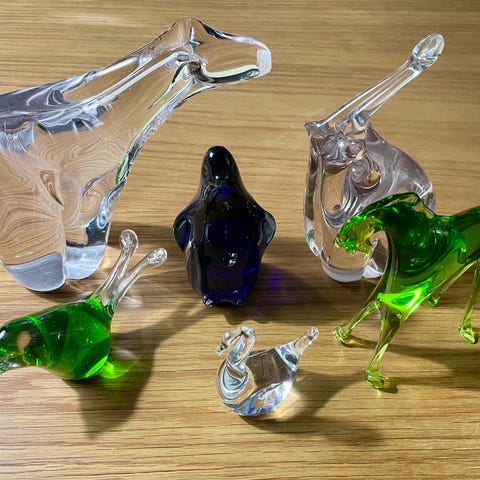 Myynnissä Humppilan lasin valmistamia kirkkaita lasifiguureja / kirjapainoja. Suunnittelija Pertti Santalahti. Kaikki todella hyväkuntoisia. Muutamia hyvin pieniä naarmuja voi olla pohjassa.