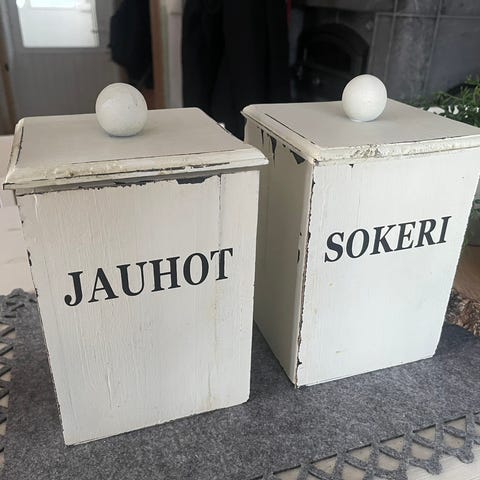 Muurlan ruudut ja raidat purkkisetti, yht 5 kpl. Kaksi isoa purkkia halk. 13,5cm ja kork 17cm. Keskikokoinen halk. 11cm ja kork 15cm ja pienet halk. 9cm ja korkeus 11cm. Kaikki uusia ja käyttämättömiä, jäivät yli. Itse säilytän näissä jauhot, pastat yms..