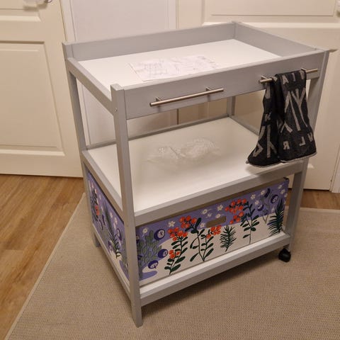 Erittäin jämäkkä hoitopöytä, jonka laatikoihin mahtuu vaippoja ja varusteita paljon. Hoitotason korkeutta voi säätää, ja tästä voi vanhemmalle lapselle rakentaa työpöydänkin. Hyvä paljon käytetty kunto. Patjansuojus mukaan, meillä oli siinä aina lisäksi pyyhe/harso/tms.