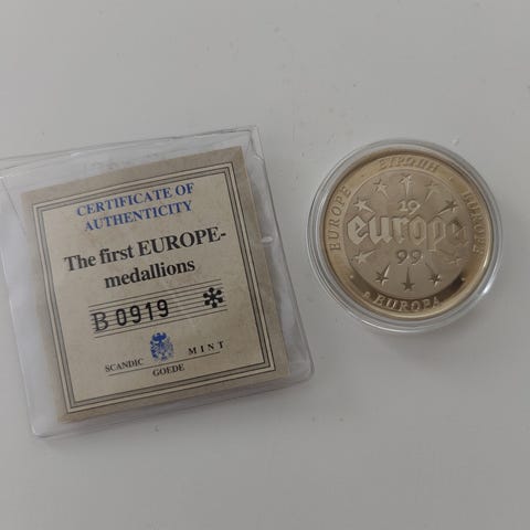 Uushopeaa. Ei ole käypää valuuttaa. Varsinainen euro tuli markkinoille vasta 2002. Madridin kokouksessa 1995 lyötiin lukkoon, että euroalueen valuutaksi tulee EURO. Se sinetöitiin 1.1.1999 ja siitä tämä erikoismitalli muistoksi.