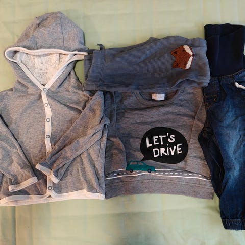 Neljät housut, huppari, fleecetakki (nyppyä) ja 5 bodia (paljon käytetyt mutta ehjät, kaikki ei nöy kuvassa). Pari vetoketjuyöpukua. Hajusteeton pesuaine käytössä. Haku tai toridiili.