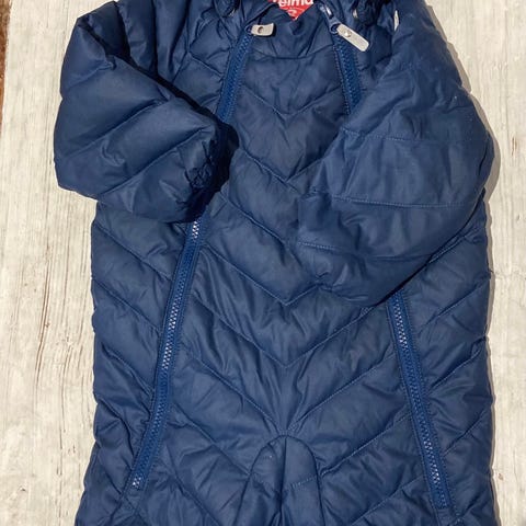 Hyväkuntoinen untuvahaalari koossa 74. Oikean polven kohdalla on pieni/kevyt viilto (viimeinen kuva), muuten haalari on ihan hyvässä kunnossa.
