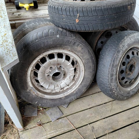 Pulttijako n. 70mm ja neljä kiinnitystä. Kesärenkaat ovat vaihtotarpeessa. Koko sarja 10€.