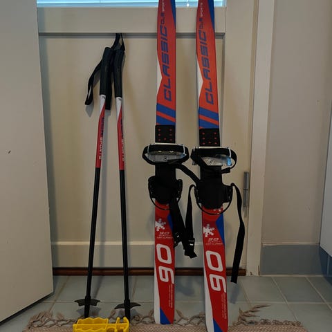 Valmispaketti hiihtoon. Monot (SNS) koko 35. Kahdet sauvat 115cm ja 120cm. Pitopohjasukset (Peltonen Mirage) 130cm SNS-siteellä. Monot ja sauvat hyvässä kunnossa, sukset kohtalaisessa. Suksien pohjissa naarmuja ja päällystettä ieronnut kärjestä. Kelvollinen setti kuitenkin koulu- ja muihin hiihtelyihin. Siteet helppokäyttöiset lapselle.