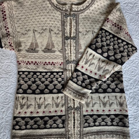 HUOM! Minulla on myynnissä muitakin vaatteita, myös useita villaneuleita kuten tuo viimeisessä kuvassa näkyvä luonnonvalkopohjainen luontoaiheinen kirjoneulevillatakki.