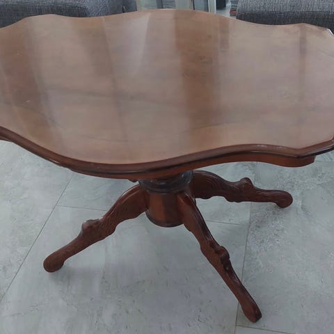 Vanha täyspuinen sohvapöytä, kulmissa koiran aiheuttamaa jälkeä. On korjattavissa.