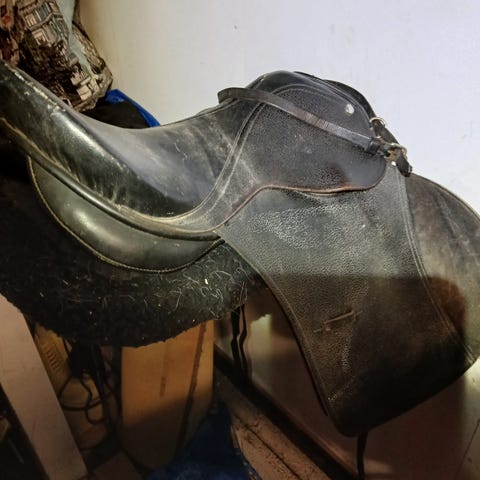 Hööksistä ostettu ponisatula ja satulahuopa. Käytetty pari kertaa puuhevosella leikeissä. Kuin uusi. (Satula uutena 100e)