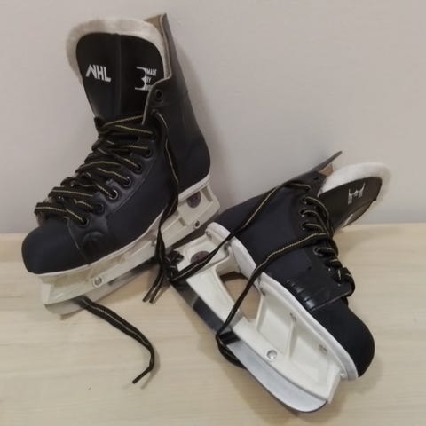 NHL-merkkiset luistimet. Kunto ihan hyvä. Pohjassa muutamat nimikoinnit, mutta se ei tietenkään haittaa käyttöä.