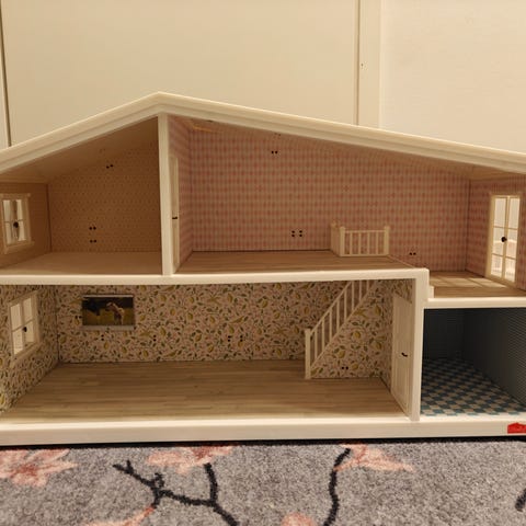 Kylppärikalusteet ja keittiö kuuluu sarjaan, muut sekalaista kalustetta. Kahteen huoneeseen itse tulostettu lattiakuvio, katossa tapettia johon piirrelty.