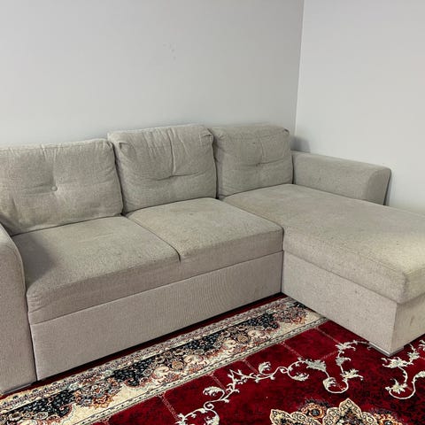 IKEA sohva tummanharmaa kangaspäällysteellä. Vain nouto. Ostajalla omat kantajat. Sijaitsee taloyhtiön toisessa kerroksessa. Ei hissiä. Kuva syvyydestä. Kuva tahrasta, jota ei ole yritetty puhdistaa. Näkyy vaan sohvan olleessa auki. Ei lemmikkieläimiä.