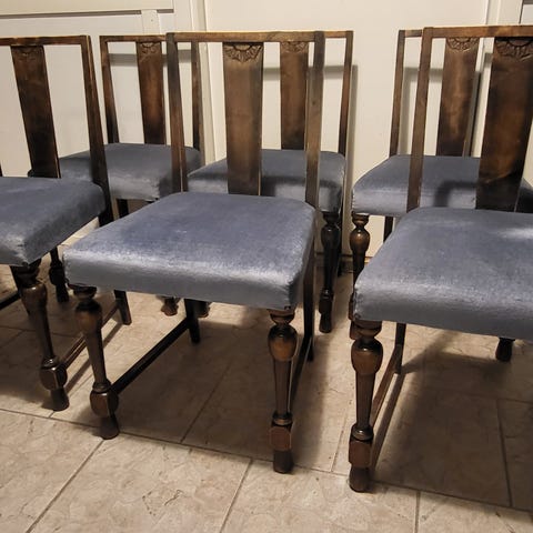 Neljä vanhaa tuolia joissa vaalea plyysisametti istuin. Siistit ja hyvässä kunnossa. Ei hajuja, säilytetty kuivassa ja lämpimässä.