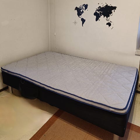 Annetaan 120cm runkopatja jaloilla. Sijauspatjaa ei siis kuulu mukaan. Yksi jaloista vaatii korjaamista (tai jos asettaa sängyn seinää vasten kuten kuvassa kestää nukkumista ilman korjaustakin :D ).