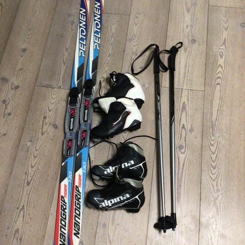 Myynnissä pari vuotta käyttämättömänä olleet Peltosen sukset, sauvat ja Karhun monot. Hyvä kunto, mutta sukset vaativat ehkä vahausta.