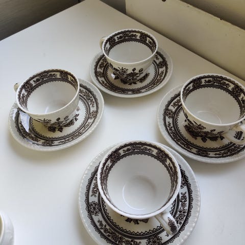 Wood & Sonsin Dorset-kuppi alulautasella,sinivalkoinen kukkakuvio,fajanssi. Ovat kuin uudet,vain koristeena olleet.