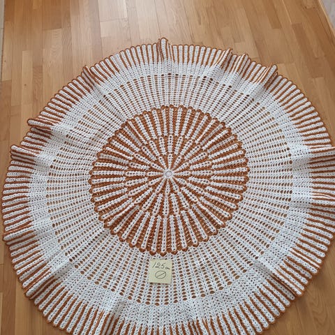Pyöreä liina. Tehty 6 säikeisestä kalalangasta. Kuvan pöytä on halkaisialtaan 100cm joten voit arvelka sopiiko liina sinun pöydällesi. Hinta 100€ postikuluineen