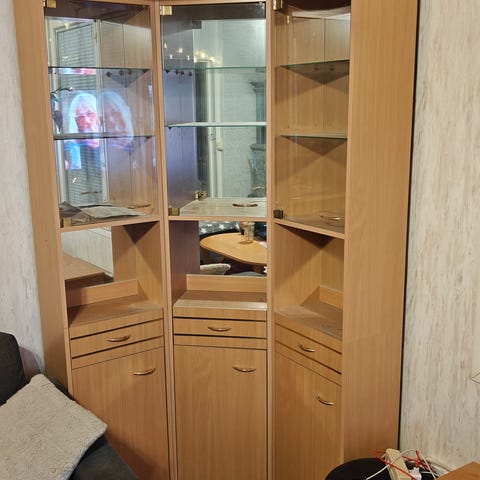 Vitrinikaappi valkoinen, jossa lasiovet ja useita hyllyjä. Kaapissa on kaksi vetolaatikkoa alaosassa. Sopii säilytykseen ja esillepanoon erilaisille esineille.