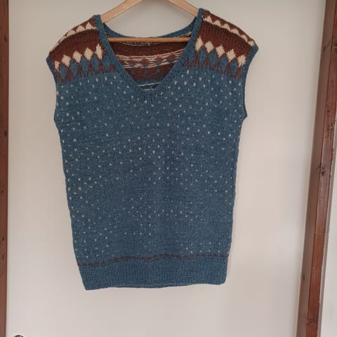 Tummanruskea käsinneulottu villaliivi / slipoveri, jonka etuosa on vaaleanruskeaa kukonaskelkuvioista kirjoneuletta. Tämän vintage-liivin langasta ei ole mitään tietoa, mutta mielestäni se on täyttä villaa. Malli sopinee niin naiselle kuin miehellekin. Koko lienee noin naisen M tai miehen S. Itse olen kokoa 38 ja tämä olisi minulle passeli, mutten valitettavasti osaa käyttää ruskeaa.